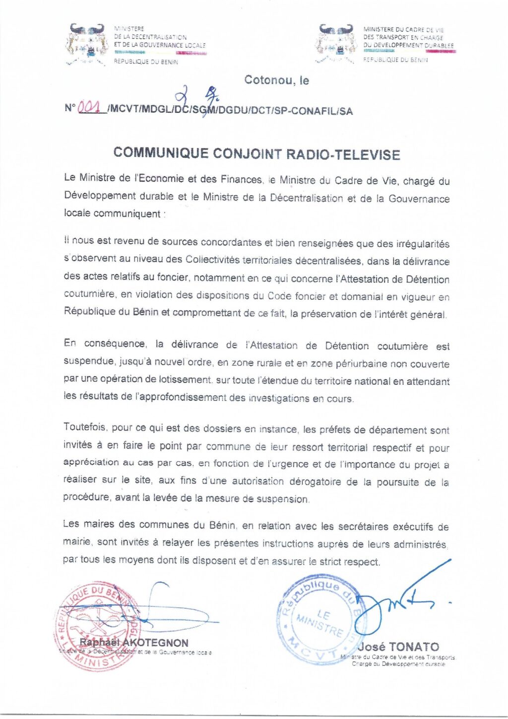 Dans un communiqué radio-télévisé, le gouvernement béninois a suspendu la délivrance de l’Attestation de Détention Coutumière (ADC) dans les zones rurales et périurbaines non couvertes par une opération de lotissement. Cette décision fait suite à une série d’irrégularités notée dans la délivrance des actes délivrés au niveau des collectivités territoriales décentralisées, et ce, en violation des dispositions du Code foncier et domanial en vigueur en République du Bénin. Toute chose qui ne favorise pas la préservation de l’intérêt général.Ainsi, la délivrance de l’acte est suspendue en attendant les résultats des investigations en cours. Il faut noter que la gestion foncière s’est révélée de la « mer à boire » dans les collectivités décentralisées avec des séries de conflits et des disparitions ou vols de terres. Récemment, à l’occasion de la réforme de la décentralisation, le gouvernement a confié cette mission à des cadres d’un certain niveau, des Responsables aux affaires domaniales et environnementales (RADE) accompagnés par des politiques et des comités de gestions. Pourtant, des couacs subsistent toujours, notamment dans les zones non loties. C’est donc ce qui justifie cette décision qui entend remettre les pendules à l’heure et améliorer davantage les pratiques.