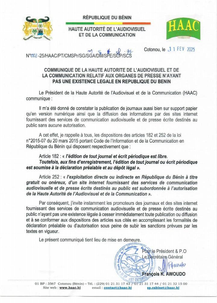 La Haute Autorité de l’Audiovisuel et de la Communication (HAAC) a annoncé qu’elle renforcerait ses contrôles sur les médias opérant sans autorisation légale au Bénin. Dans un communiqué publié ce mardi 11 février 2025, signé par le Secrétaire Général François Awoudo, l’institution rappelle que la publication de journaux, qu’ils soient imprimés ou numériques, ainsi que la diffusion d’informations sur des plateformes en ligne, doit impérativement être précédée d’une déclaration ou d’une autorisation officielle.