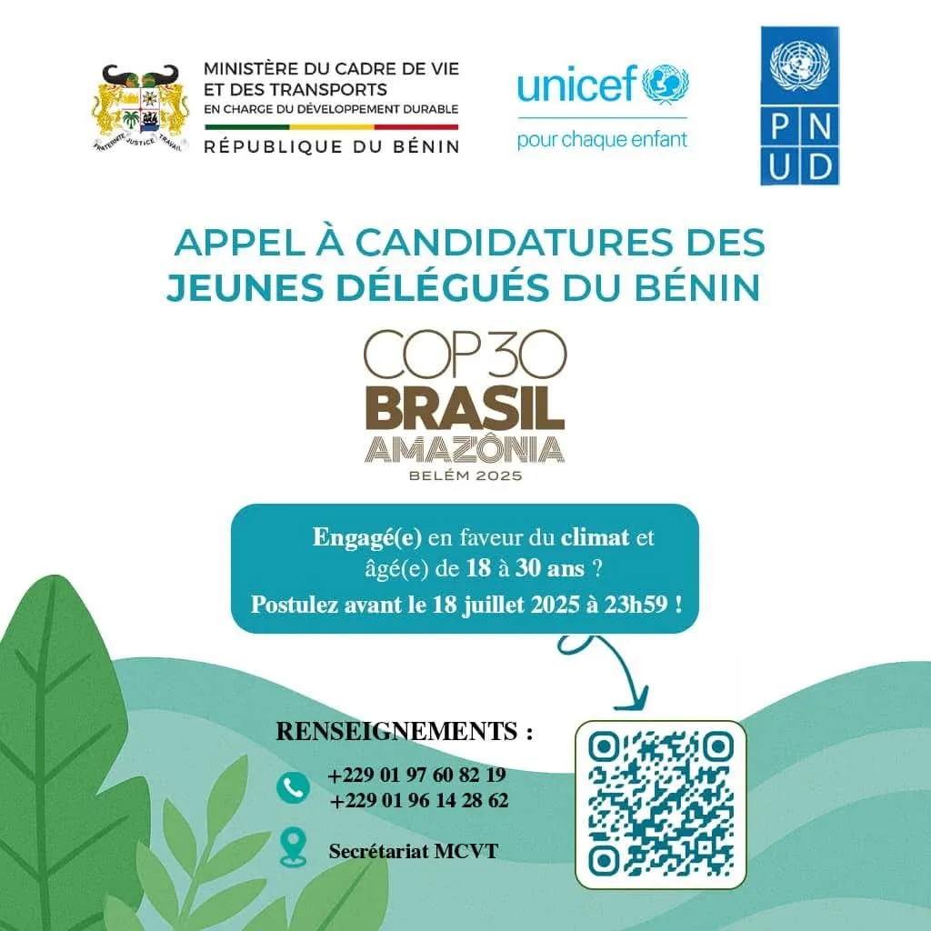 Tu es passionné par l’environnement, tu t’impliques déjà dans des actions pour la planète, et tu rêves de représenter le Bénin à l’international ? Le Ministère du Cadre de Vie et des Transports, en charge du Développement Durable, en partenariat avec l’UNICEF et le PNUD, lance l’appel à candidatures pour l’édition 2025 du concours de sélection des jeunes délégués à la COP30.