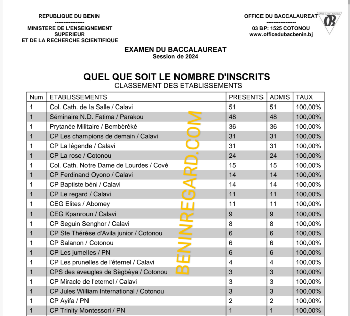 Au Bénin, l’office du baccalauréat a dévoilé la liste des 22 établissements qui ont obtenu un taux de réussite de 100% à l’examen du Baccalauréat session de juin 2024.