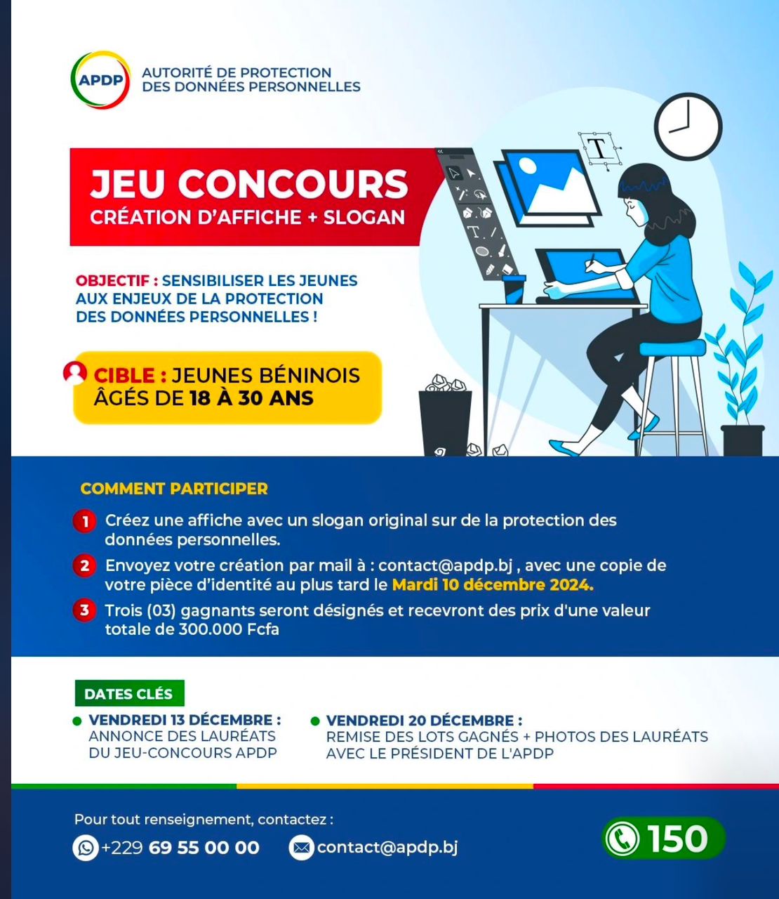 L’ Autorité de Protection des Données Personnelles (APDP) Bénin , lance un appel vibrant à la jeunesse béninoise pour un engagement actif dans la sauvegarde de la vie privée en ligne à travers un concours innovant. Ce défi propose aux participants de concevoir une affiche dynamique accompagnée d’un slogan accrocheur, dans le but de promouvoir la conscientisation à la sécurité des données personnelles.