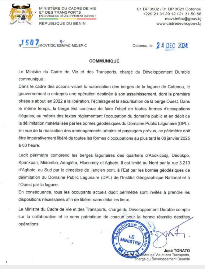 Un communiqué officiel, émis le 24 décembre par le ministère du Cadre de Vie et des Transports, intime aux occupants des rives orientales de la lagune de Cotonou de quitter les lieux. Cette mesure d’expulsion concerne spécifiquement les riverains des quartiers d’Abokicodji, Dédokpo, Kpankpan, Midombo, Adogléta, Hlacomey et Agbato.