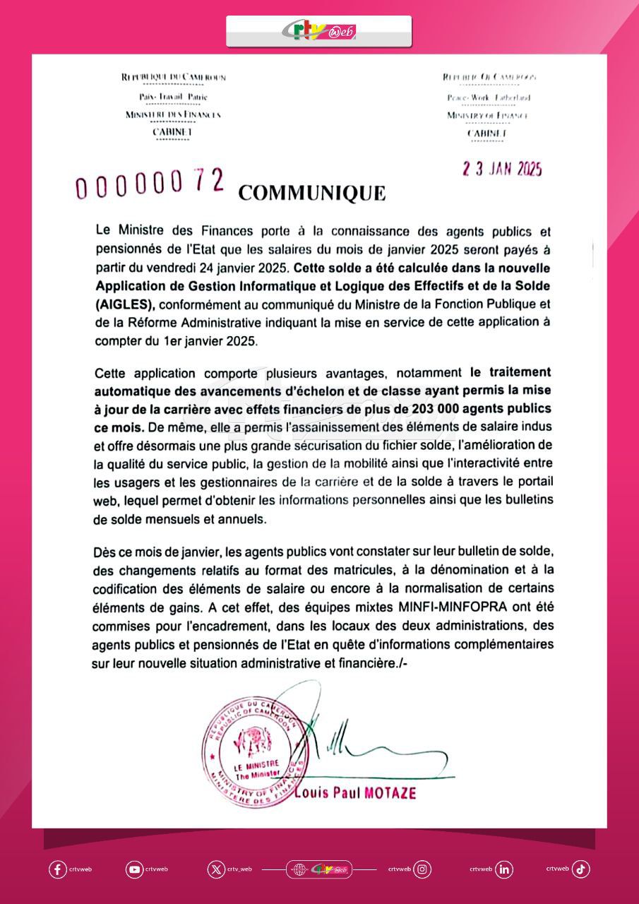 Le Ministère des Finances du Cameroun a informé les agents publics et les pensionnés de l’État que le paiement des salaires du mois de janvier 2025 sera effectué à partir de ce vendredi 24 janvier 2025. Cette solde a été calculée grâce à la nouvelle Application de Gestion Informatique et Logique des Effectifs et de la Solde (AIGLES), qui a été mise en service le 1er janvier 2025, comme l’avait annoncé précédemment le Ministère de la Fonction Publique et de la Réforme Administrative.