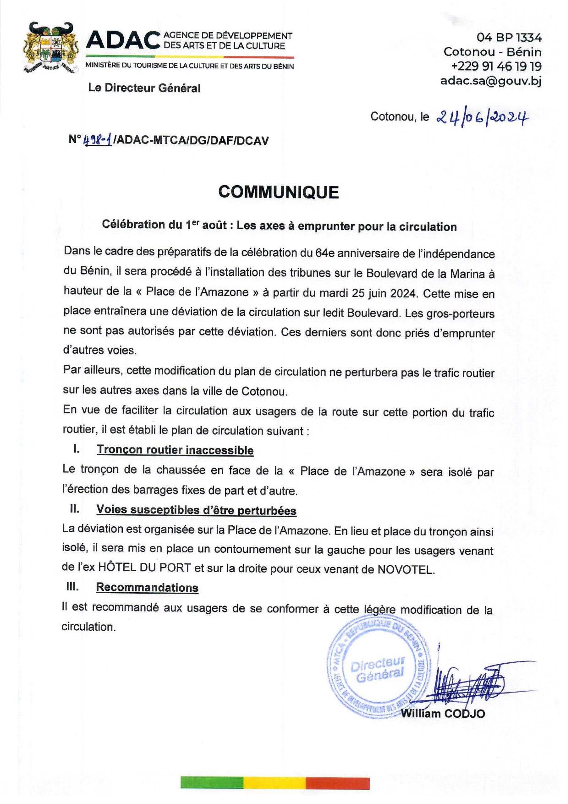 L’Agence de développement des arts et culture (ADAC) porte à l’attention de la population de Cotonou et environs que la circulation va connaitre des perturbations au niveau de certains axes routiers dans le cadre de la célébration du 64è anniversaire de l’indépendance du Bénin, le 1er aout prochain.