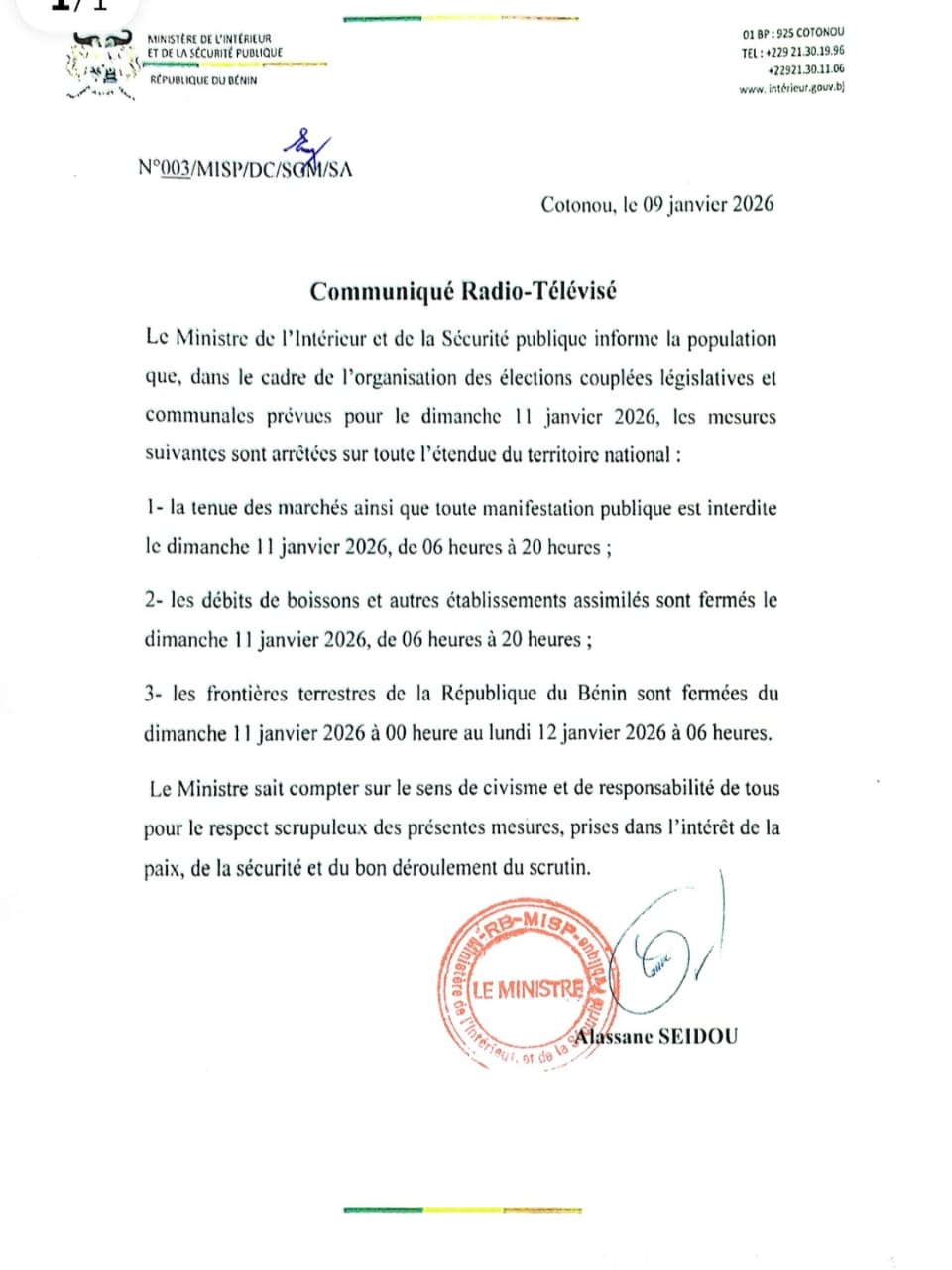 À quarante huit heures du double scrutin législatif et communal du dimanche 11 janvier 2026, le gouvernement béninois renforce le dispositif sécuritaire. Le ministère de l’Intérieur et de la Sécurité publique a dévoilé une série de mesures destinées à encadrer le vote et à préserver l’ordre public.