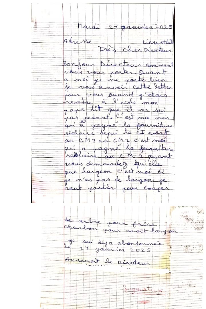 Pour rappel, mardi dernier, une lettre manuscrite, laissée sur la table de l’élève A.C. à l’école primaire publique de Glazoué, avait bouleversé la communauté scolaire. Dans ce courrier, A.C. expliquait, avec beaucoup de sincérité, son incapacité à continuer sa scolarité à cause des soucis financiers, malgré les efforts de ses parents pour le soutenir jusque-là.