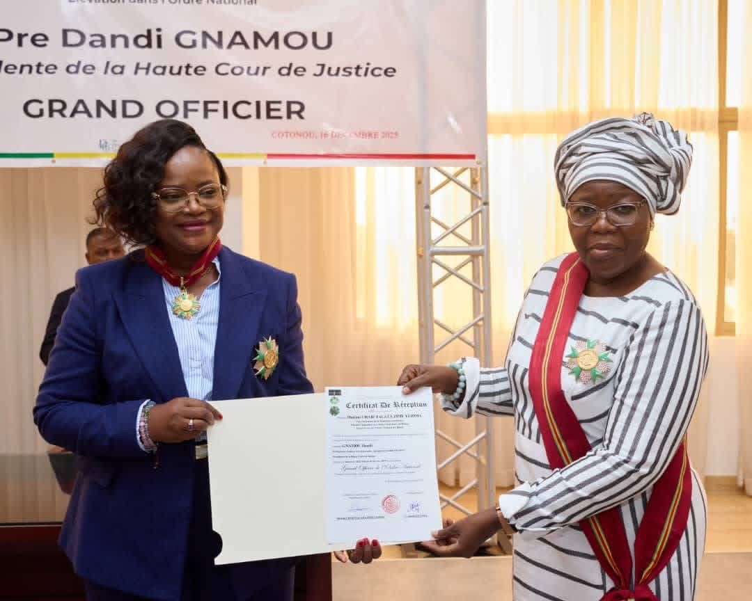 La Présidente de la Haute Cour de Justice, la professeure Dandi Gnamou, a été élevée au rang de Grand officier de l’Ordre national du Bénin, ce mardi 16 décembre 2025, au siège de la juridiction à Cotonou.