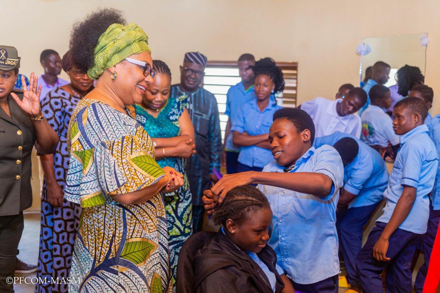 Première étape : le Centre de formation professionnelle des personnes handicapées de Péporyakou, à Natitingou, dans le département de l’Atacora. Aux côtés de la préfète Lydie Déré Chabi Nah et d’une délégation ministérielle, la ministre est venue s’enquérir des conditions d’apprentissage des pensionnaires et les encourager personnellement. Accueillie dans une ambiance chaleureuse, elle a pu mesurer le dynamisme, la résilience et la détermination des apprenants, visiblement portés par les efforts du gouvernement à leur égard.