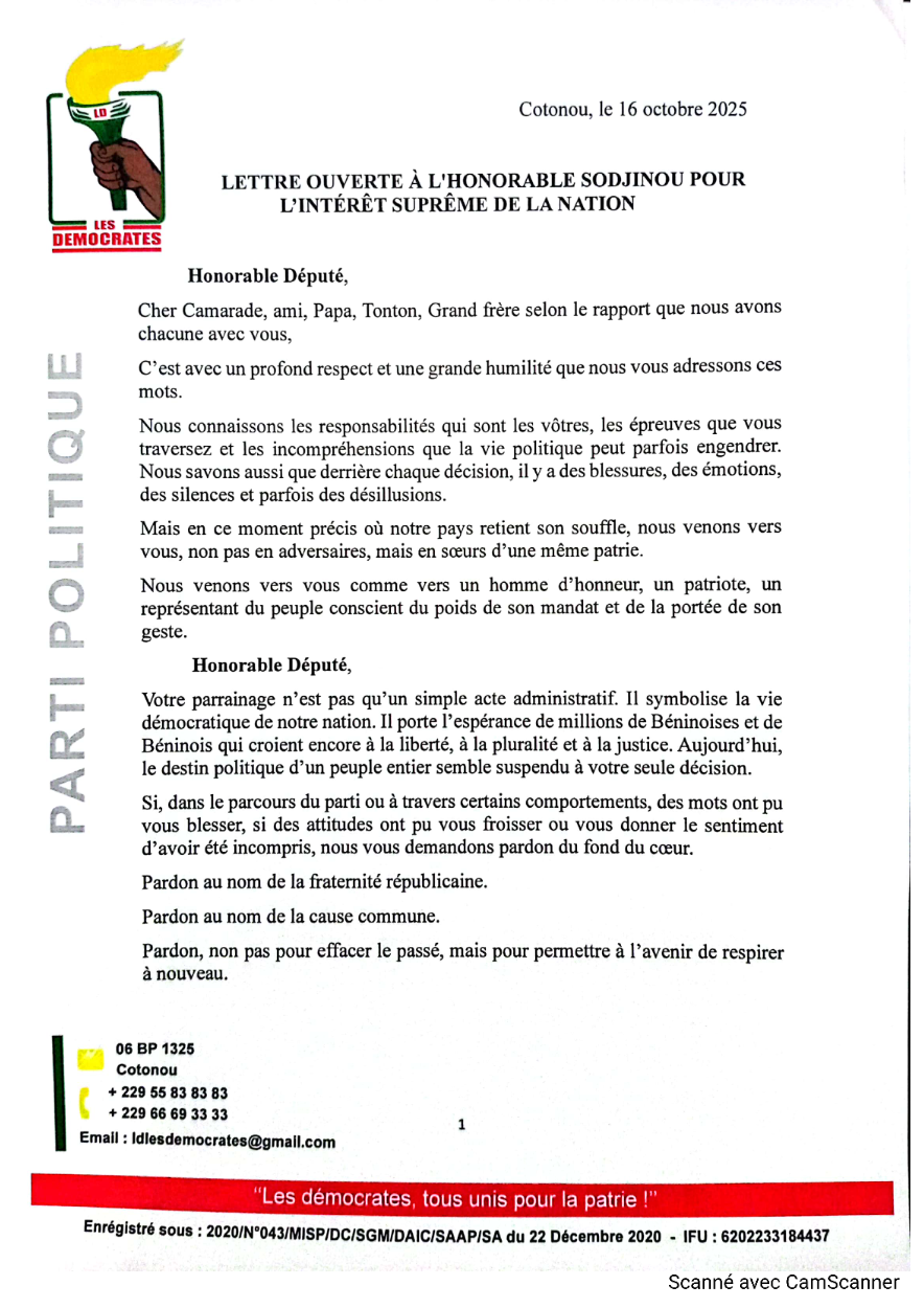 L’affaire autour du parrainage du duo de candidats du parti Les Démocrates continue de faire réagir. Après la sortie des 25 coordonnateurs, c’est désormais un groupe de 18 militantes engagées, qui ont pris la plume pour adresser une lettre ouverte au député Michel Sodjinou. À travers ce message empreint de respect, elles l’invitent à renouer avec l’esprit d’unité et de fraternité politique, à quelques mois d’une échéance présidentielle décisive.