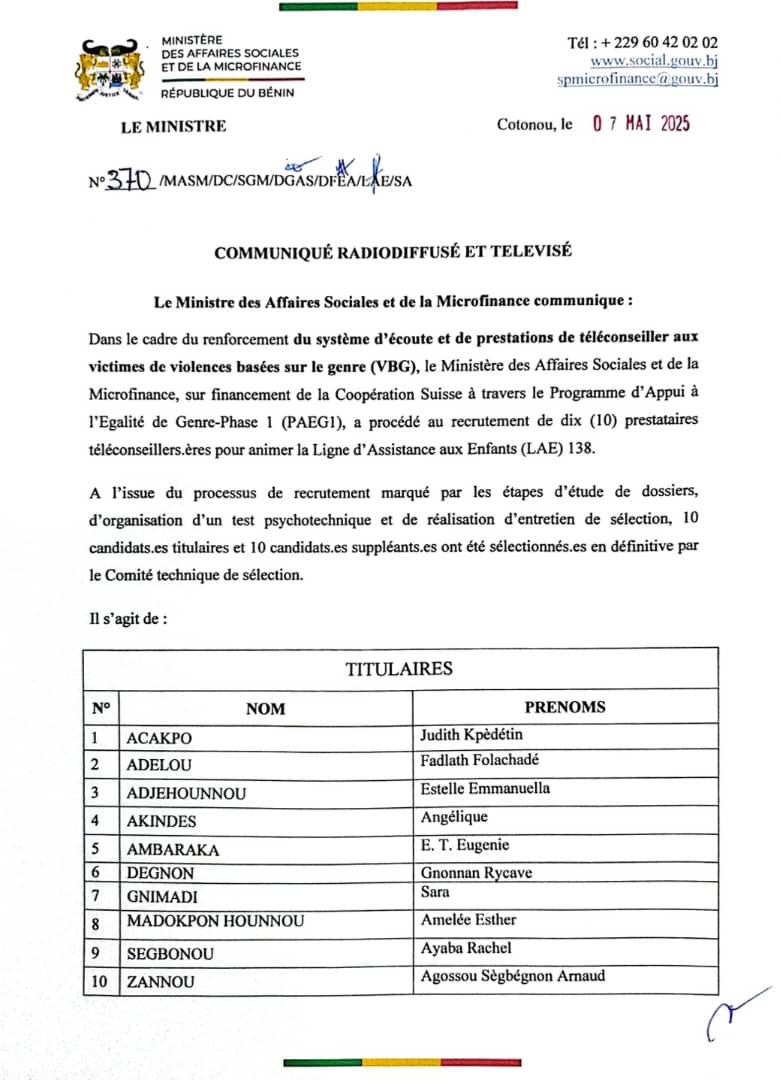 Le Ministère des Affaires Sociales et de la Microfinance renforce son dispositif de lutte contre les Violences Basées sur le Genre (VBG). Dans ce cadre, de nouveaux téléconseillers et téléconseillères viennent d’être recrutés pour prendre en charge l’écoute et l’accompagnement via la Ligne d’Assistance aux Enfants (LAE) : le 138.