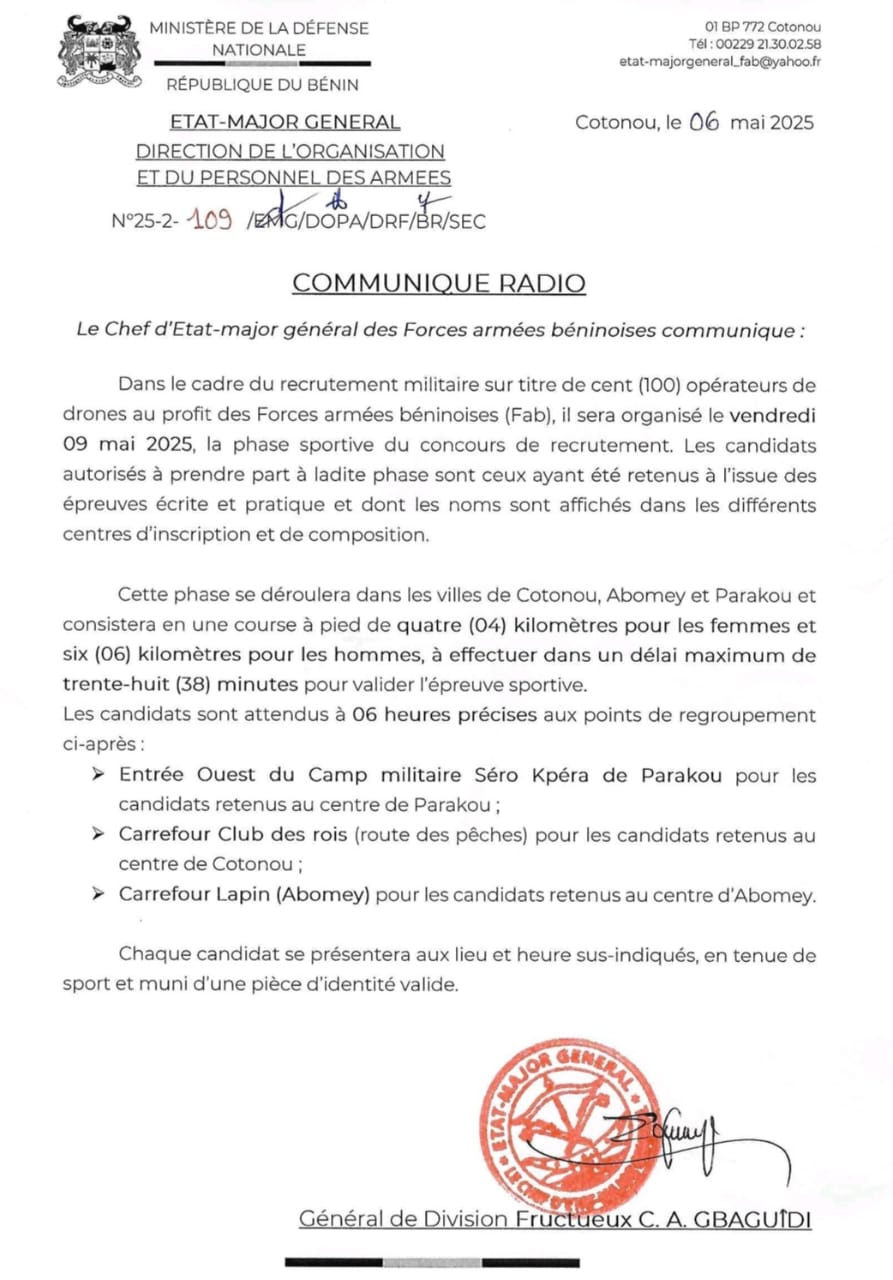 Dans le cadre du recrutement de 100 opérateurs de drones au profit des Forces armées béninoises (FAB), la phase sportive du concours se tiendra ce vendredi 9 mai 2025.