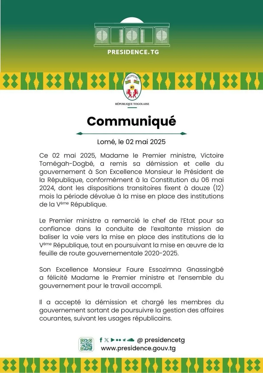 Avec cette démission, le Togo entre dans une phase de transition d’un an, comme le prévoit la nouvelle loi fondamentale. Cette période vise à installer progressivement les institutions de la 5e République, avec en ligne de mire un renforcement de la gouvernance et une modernisation du système politique togolais.