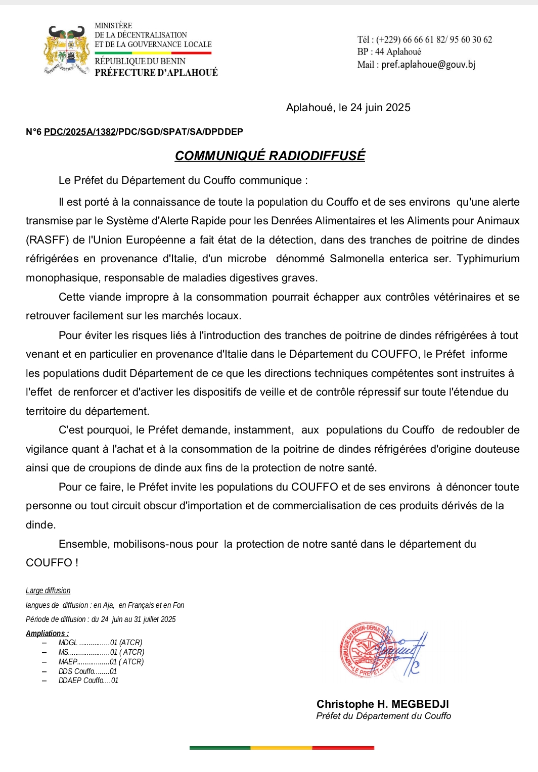 Le Préfet du département du Couffo, Christophe Megbedji, met en garde les consommateurs contre des tranches de poitrine de dinde réfrigérées en provenance d’Italie. Ces produits sont suspectés de contenir la bactérie Salmonella enterica ser. Typhimurium monophasique, connue pour provoquer de sérieuses infections digestives.