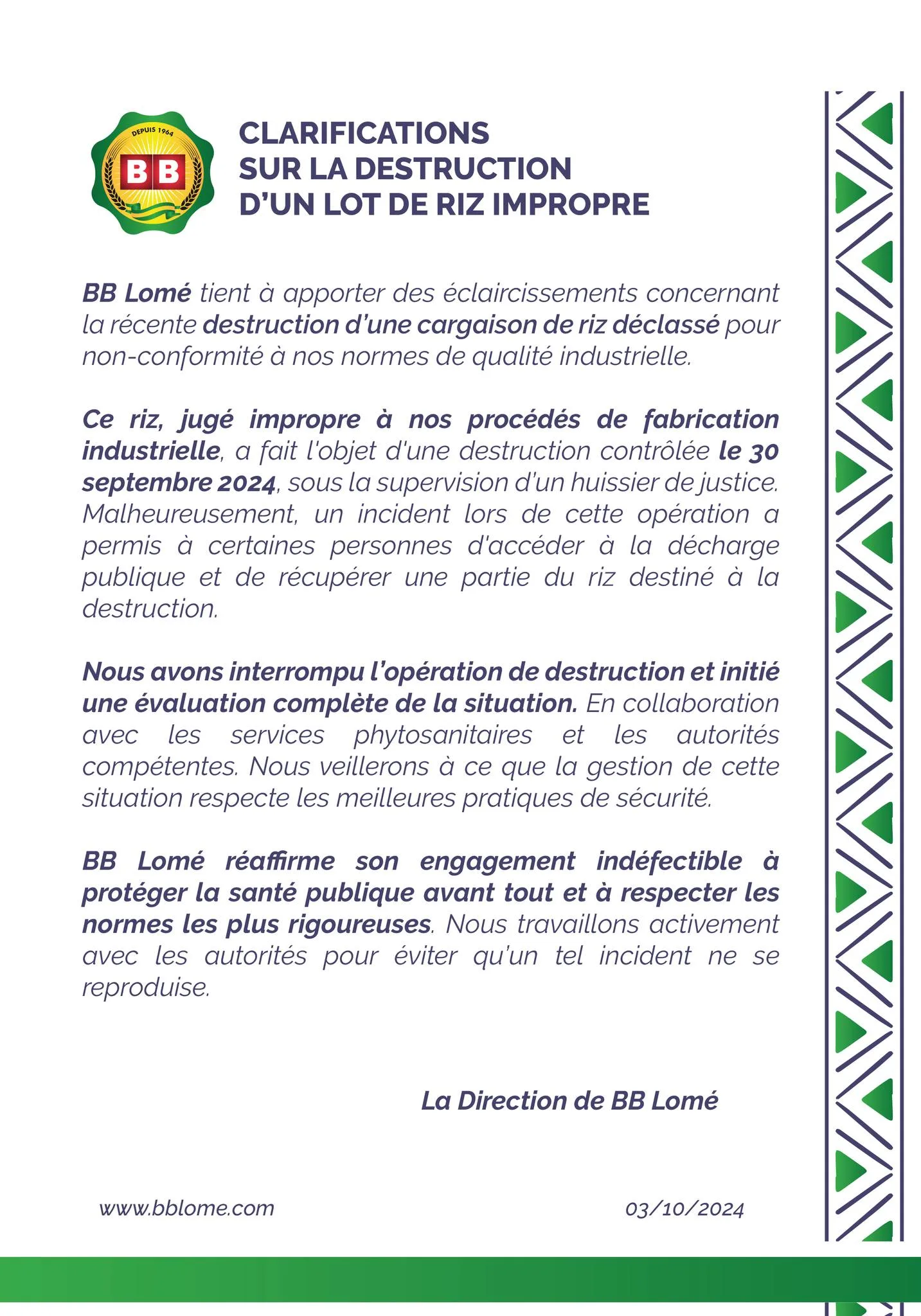La brasserie BB Lomé, auteur de l’acte a décidé de donner les raisons de son acte à travers un communiqué. Selon l’entreprise, ce lot de riz ne répondant plus aux normes de qualité industrielle, devait initialement être détruit le 30 septembre 2024 sous la supervision d’un huissier de justice.