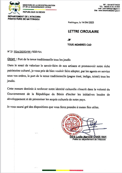 Nouvelle mesure culturelle dans le département de l’Atacora. Par une circulaire en date du 14 avril 2025, le préfét Déré Lydie Martine Chabi Nah a instruit tous les agents publics du département à revêtir une tenue traditionnelle béninoise chaque jeudi.