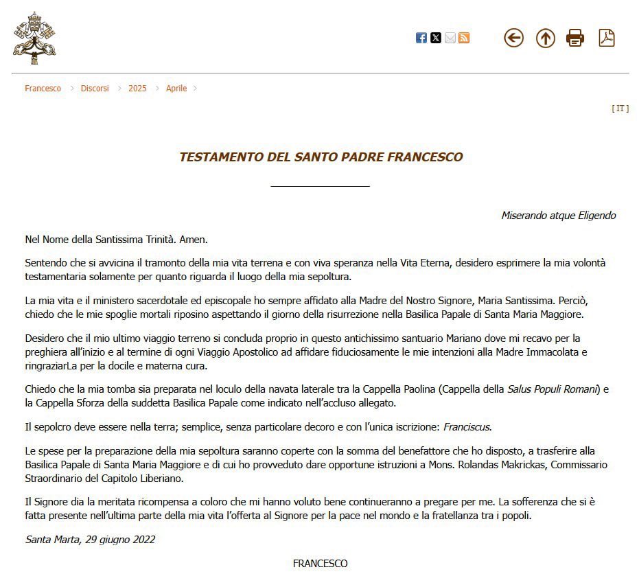 Voici le contenu du Testament du Saint Père François